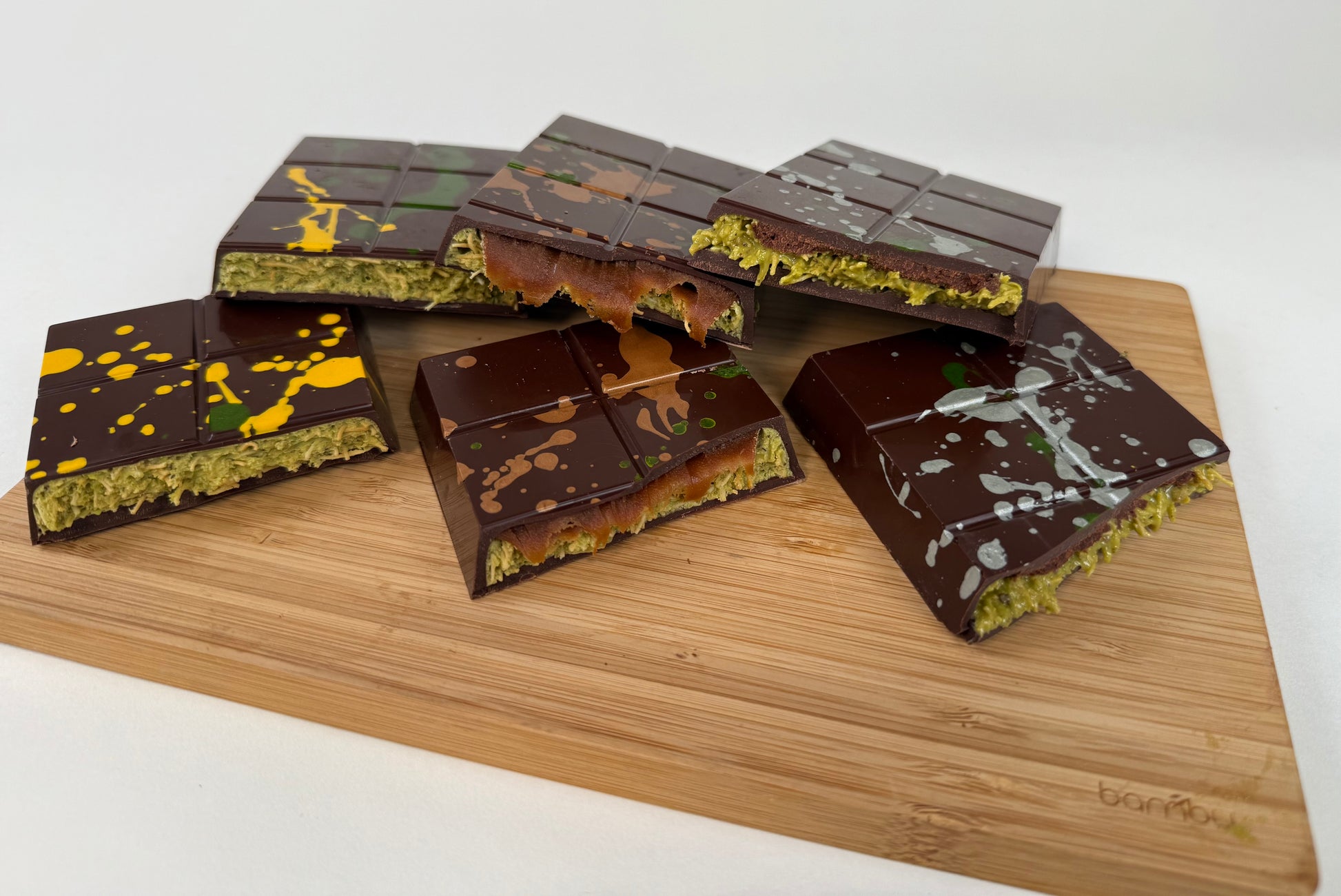 Ingredients: Bittersweet chocolate 65% cacao (Cacao beans, cane sugar, cocoa butter, sunflower lecithin, vanilla beans), pistachios, powdered sugar, kataifi (wheat flour), white chocolate (cocoa butter, cane sugar, full cream milk, lactose, sunflower lecithin, vanilla beans), cocoa butter, butter, glucose syrup, salt, colored cocoa butter.